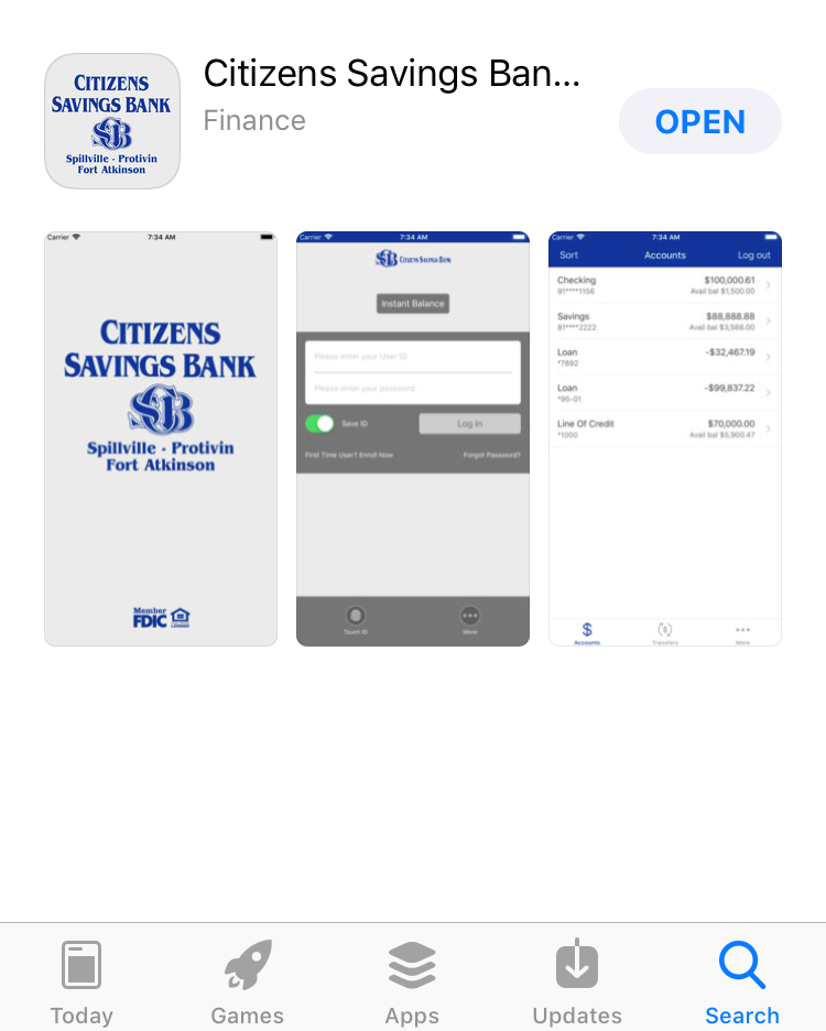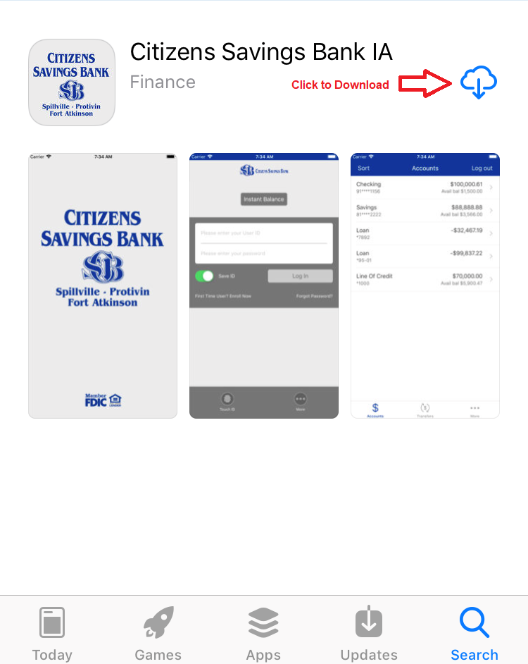 Search for Citizens Savings Bank IA on the App Store or Google Play. Click on the Download Icon to download the App.