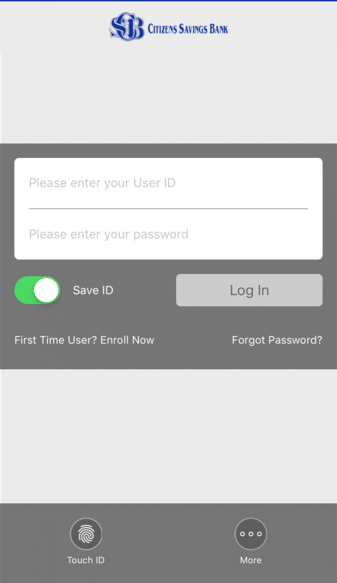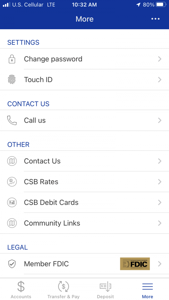 You will now be at your mobile banking home page. Across the bottom of the screen you will see Accounts, Transfer & Pay, Deposit and More. The Accounts tab will allow you to view your account balances, transactions and images of checks and deposits. The Transfer & Pay tab will allow you to make transfers between your Citizens Savings Bank accounts and pay vendors that you have set up in Bill Pay (see Bill Pay for step by step instructions on how to use Bill Pay). The Deposit tab will allow you to make deposits into your accounts of checks you receive, using the camera on your mobile device (see Mobile Deposit for step by step instructions on how to use Mobile Deposit). The More tab (seen below) allows you to change your password, set up Touch ID, access quick links on the Citizens Savings Bank website and review Terms & Conditions and Acknowledgements.