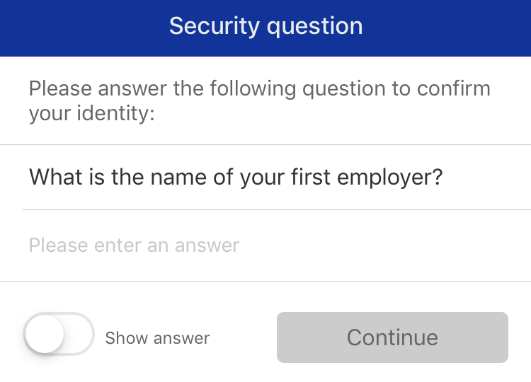 You will be prompted to answer one of your security questions that you set up within online banking and click Continue. **Note** You should only be prompted for a security question during the initial mobile banking enrollment.