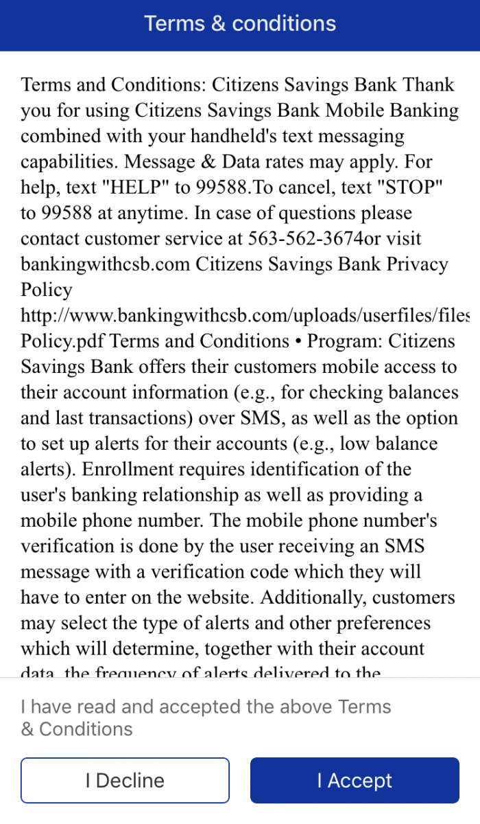 You will then be prompted to read and accept the Citizens Savings Bank Mobile Banking Terms & Conditions. Click I Accept to continue.