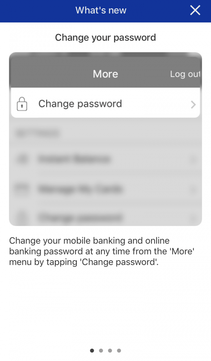 You will then get screens that you can slide through that explain some of the features of the mobile banking app, including how to change your password, logging in with Touch ID, the accounts page Quick Links and how to make transfers. Once you have scrolled through the pages you will click the X in the upper right hand corner to exit.